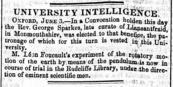 after writing the entry for Robert Walker, an unjustly neglected Oxford physics professor, for the Dictionary of National Biography (Missing Persons volume, 1993), I drafted a note (that's academic-speak for an article too piddling to deserve the name) about one of his more ambitious experimental demonstrations; that there'd been a huge, spectacular Foucault's pendulum in Oxford like the famous one at the Panthéon in Paris seems to be one of Oxford science's best-kept secrets, never mind that it was also one of the earliest; as often happened, my article was never finished or published, meaning that in returning to it now I've been able to amplify it considerably